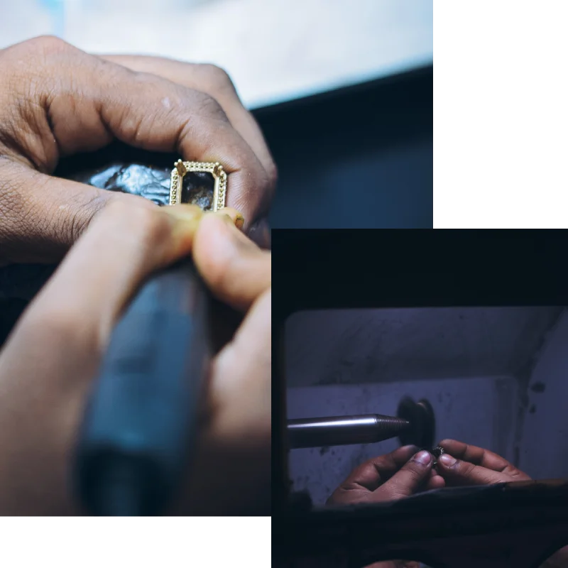 Our process begins with a consultation where we will work with you to determine your design preferences, budget, and any other specific requests you may have. We’ll discuss your ideas and show you samples of materials, gemstones, and any personalization that we can incorporate into your design. Once we have a clear understanding of your preferences, we’ll create a sketch of your design for your approval. From there, we’ll begin the process of bringing your design to life. Our team of experienced artisans will then begin the intricate process of crafting your piece by hand, paying close attention to every detail to ensure that it meets our high standards of quality and craftsmanship. When your piece is complete (takes about 6-8 weeks), we’ll ensure that it fits perfectly and meets your expectations.