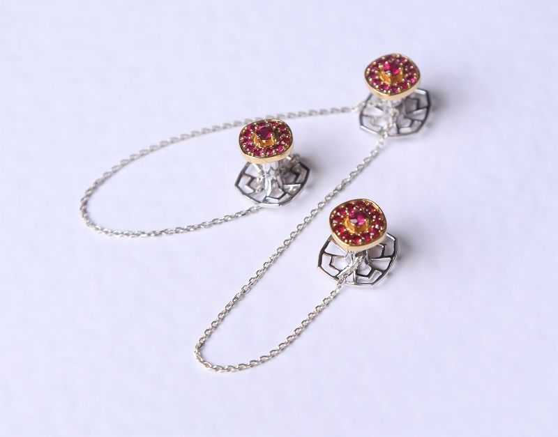 Ayaan is an exemplary Burma Ruby kurta button set for men linked together in a silver chain and with the Faya logo at the base. The square-shaped buttons with gold micron plating at the top are perfect to enhance your look on every occasion.
