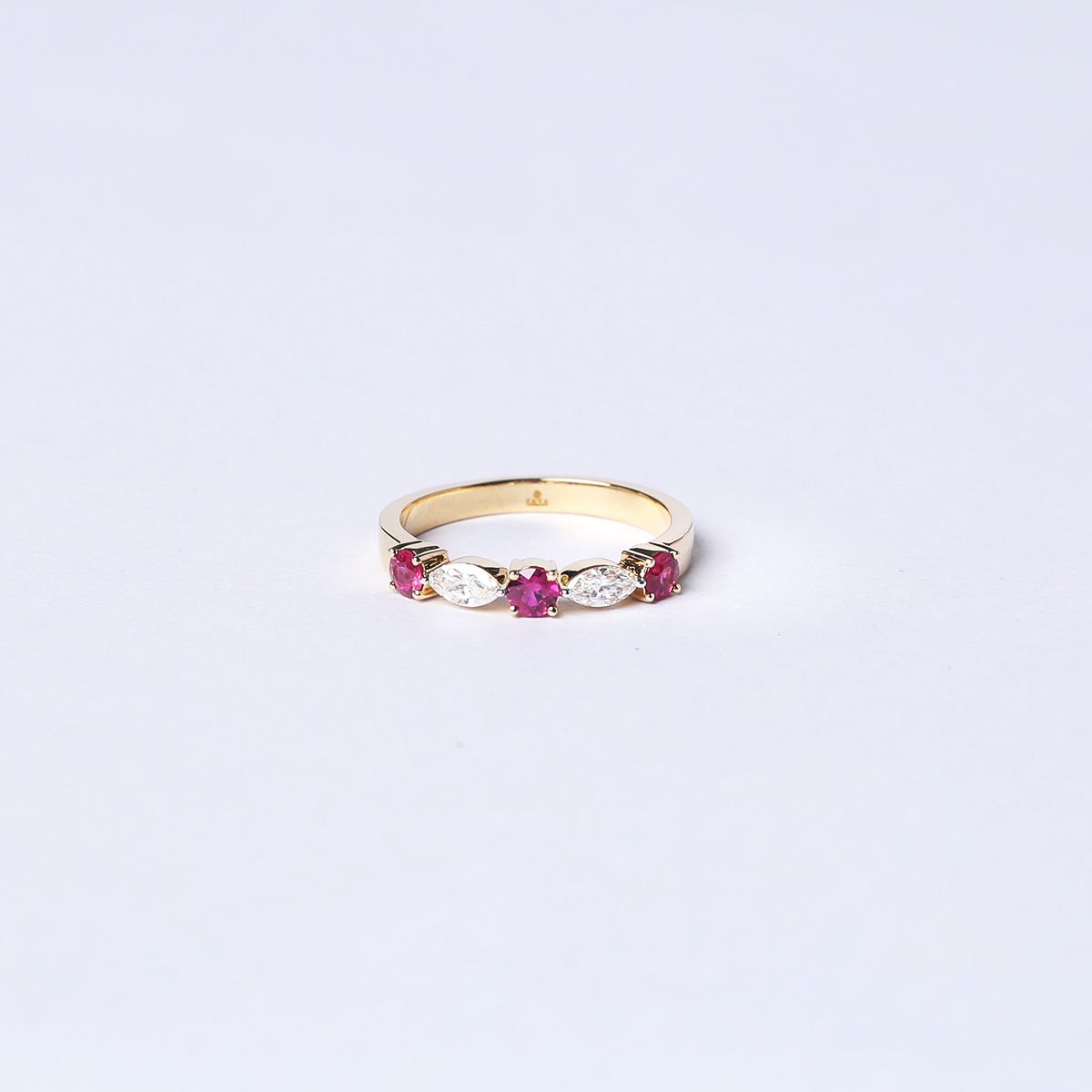 Meanwhile, marquise-cut diamonds enhance the design with light and movement. Their elongated form reflects brilliance beautifully, creating contrast against the deep red tones of the rubies. As a result, the ring achieves a refined interplay of colour and sparkle that feels both dynamic and balanced.