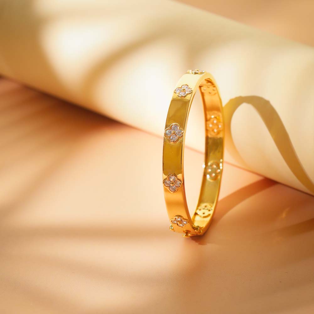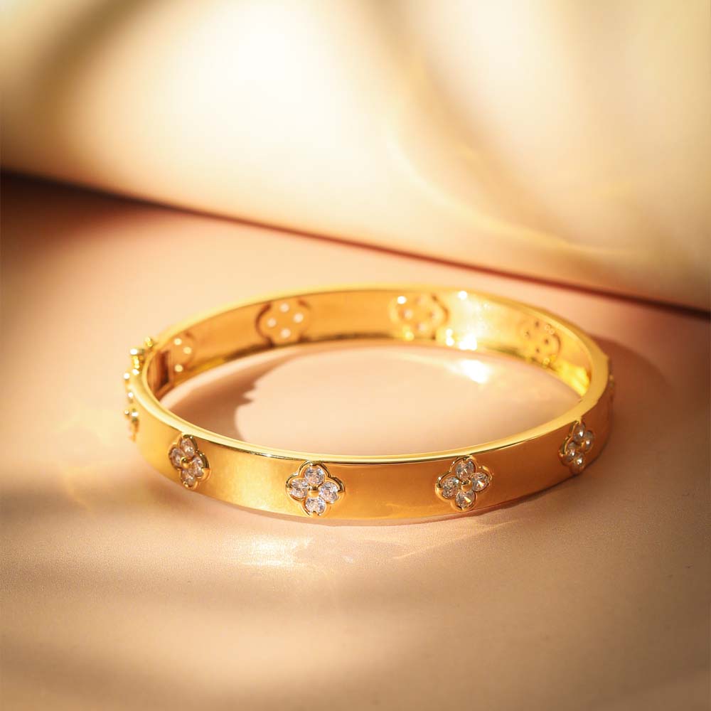 The Clover Bangle by Faya Jewels is a sophisticated accessory that combines elegance with meaningful symbolism. Featuring the iconic clover motif, this bangle represents luck, harmony, and positivity. Its refined design enhances any outfit while making a subtle statement about personal style and intention.