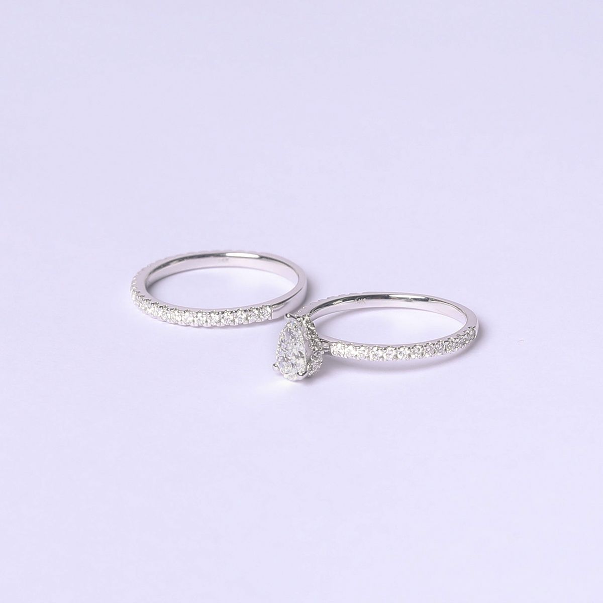 If you’re dreaming of a pear shaped conflict free diamond for your engagement ring, you’re not alone. This swanky tear shaped diamond is both chic and timeless. Our diamonds are cut from the highest purity diamond crystals, have optimal cut and sparkle, and are always eye clean. The 0.56 ct centre pear diamond is delicately set on a 14k white gold band and comes with a half eternity band in pave setting.