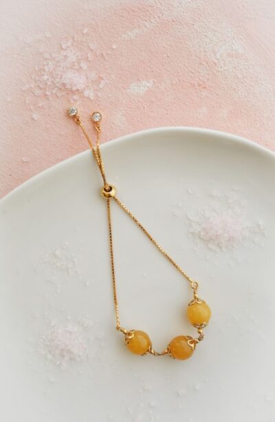 The Ellie bracelet is one piece we recommend in your jewelry box. So dainty and minimal you’ll want to wear it all day. 3 charming yellow amber beads strung together in a beautiful 18k gold chain.