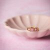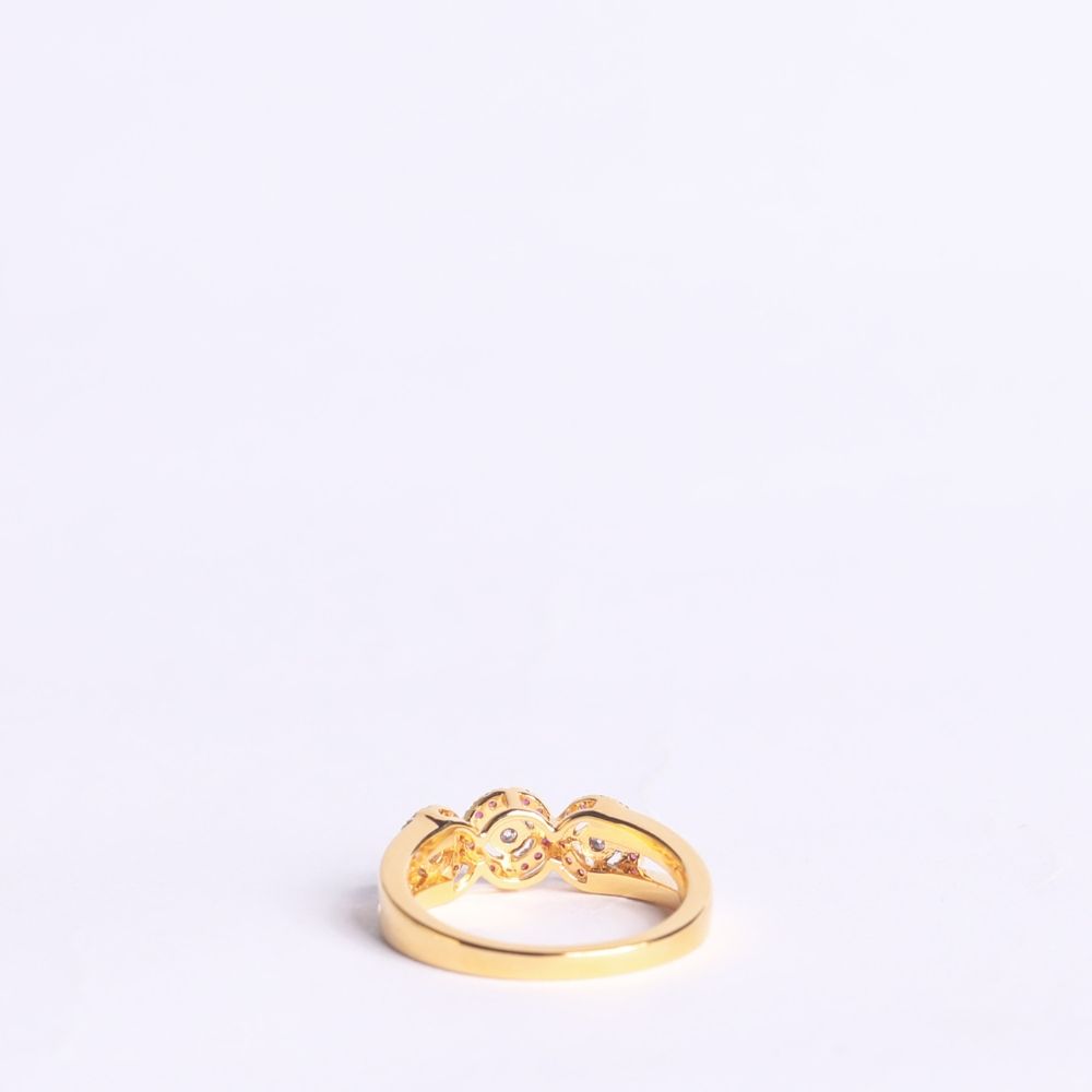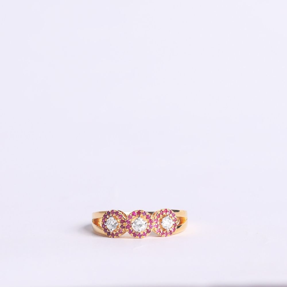 Lana Ruby Diamond Ring, a stunning piece of jewelry that is both environmentally friendly and ethically conscious. Crafted in 18k yellow gold, this ring features three halos of vibrant rubies surrounding a breathtaking centre diamond.