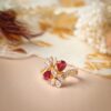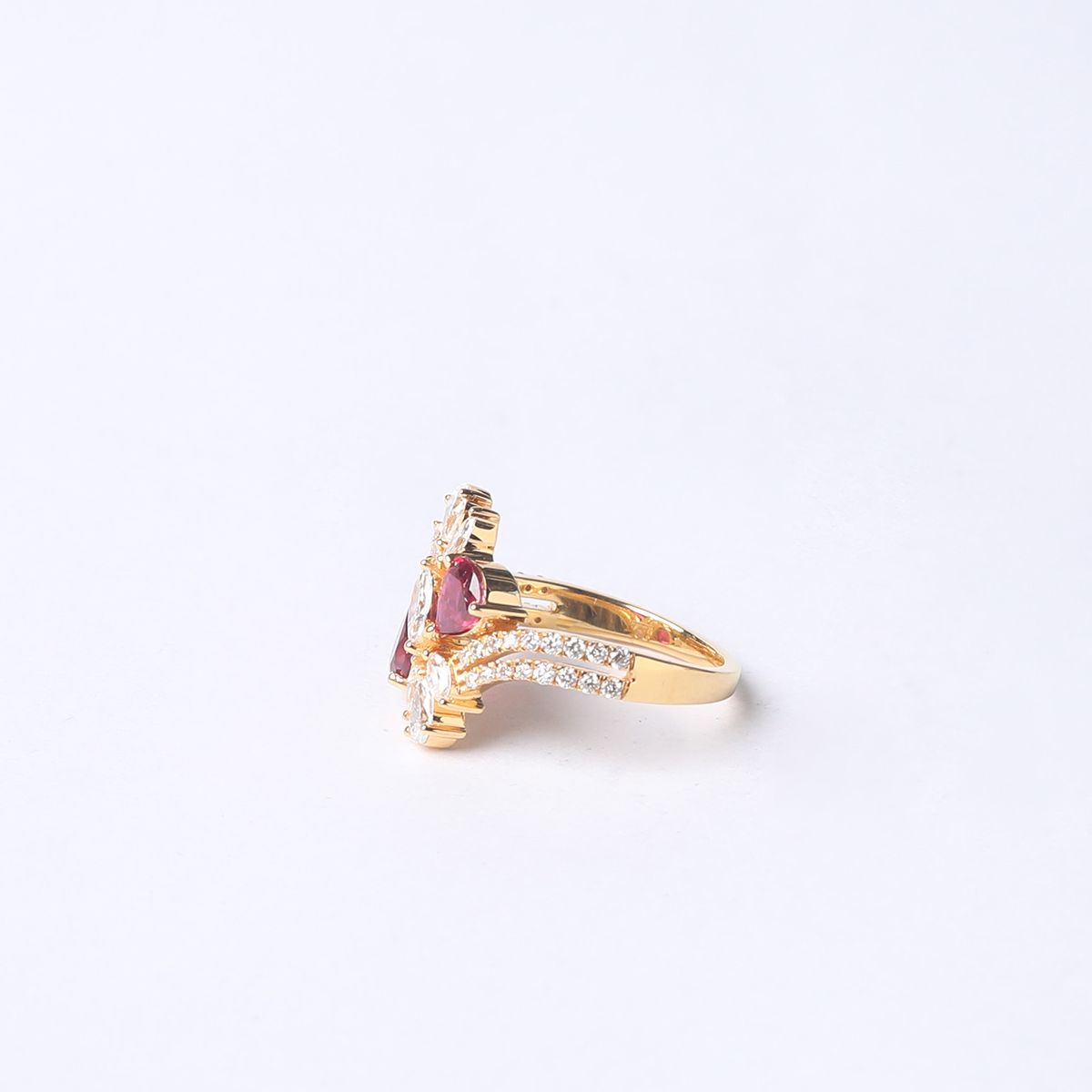 This stunning Maribel Pear Ring is crafted in 18k yellow gold, and features exquisite pear-shaped Burma Rubies surrounded by pear and marquise shape lab grown sustainable Diamonds. The Rubies are of a vivid red color and has an excellent cut. The diamonds enhance the beauty of the Rubies, creating a vibrant and eye-catching design. The ring is perfect for any special occasion, and is sure to be cherished for many years to come