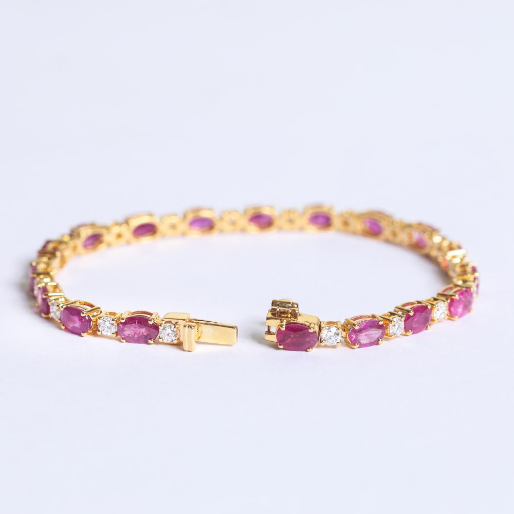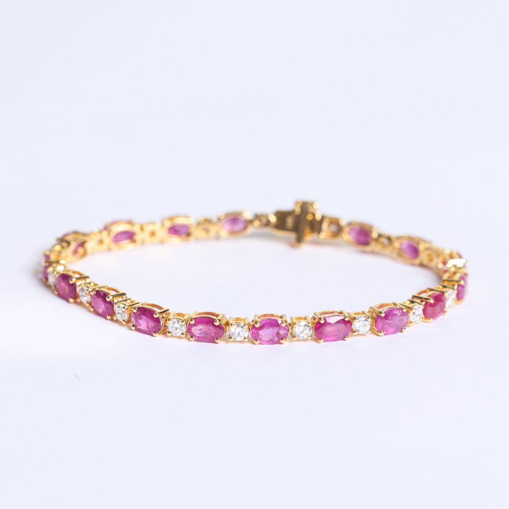The Myra Ruby Diamond Bracelet is a beautiful piece of jewelry that features a combination of lab-grown diamonds and natural oval rubies. The bracelet is crafted with care and attention to detail, ensuring both comfort and style. It is a timeless and sophisticated piece of jewelry that combines the sparkle of lab-grown diamonds with the rich color of natural rubies. It is an exquisite accessory that can be worn for special occasions or as an everyday statement piece, adding a touch of elegance and glamour to any ensemble.