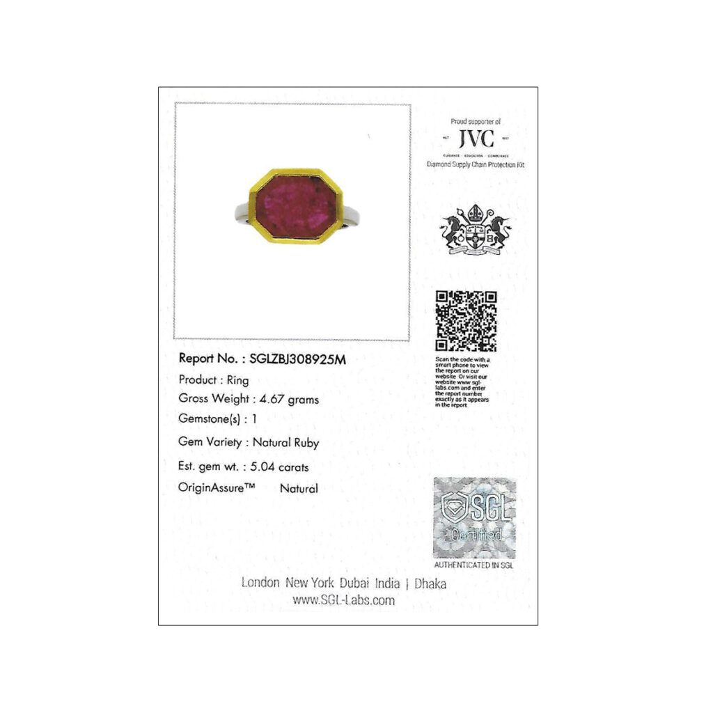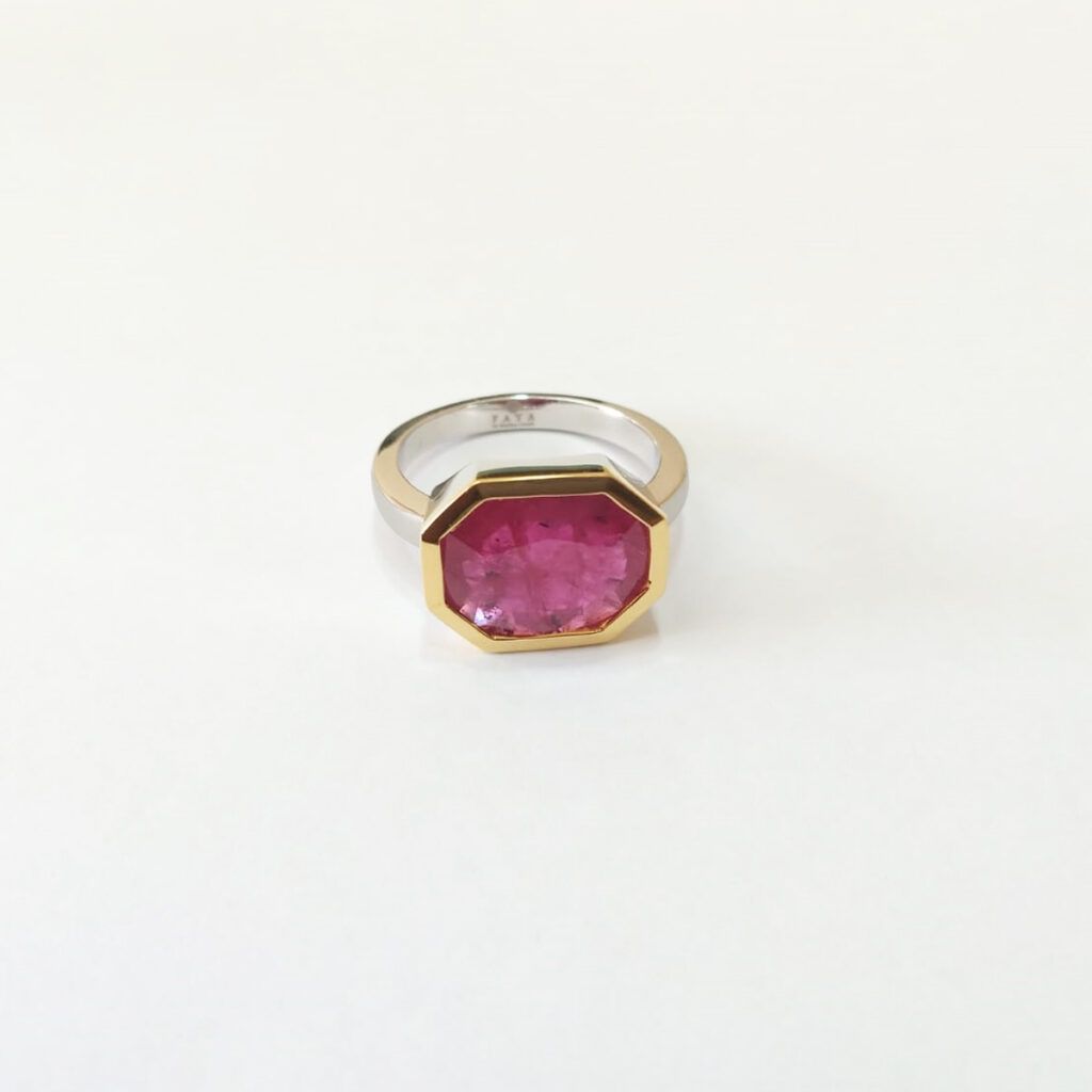 Indulge in the luxurious beauty of our classic Ruby Ring for men. Designed in 18k gold and silver with a gorgeous 5 ct Mozambique Ruby this gents ring is shaped in a geometric Octagon shape to enhance its beauty and give a solid structure to its frame making it unique and attractive. Treat yourself to this timeless treasure and make a statement in Faya Jewels where gem quality meets excellent craftsmanship.