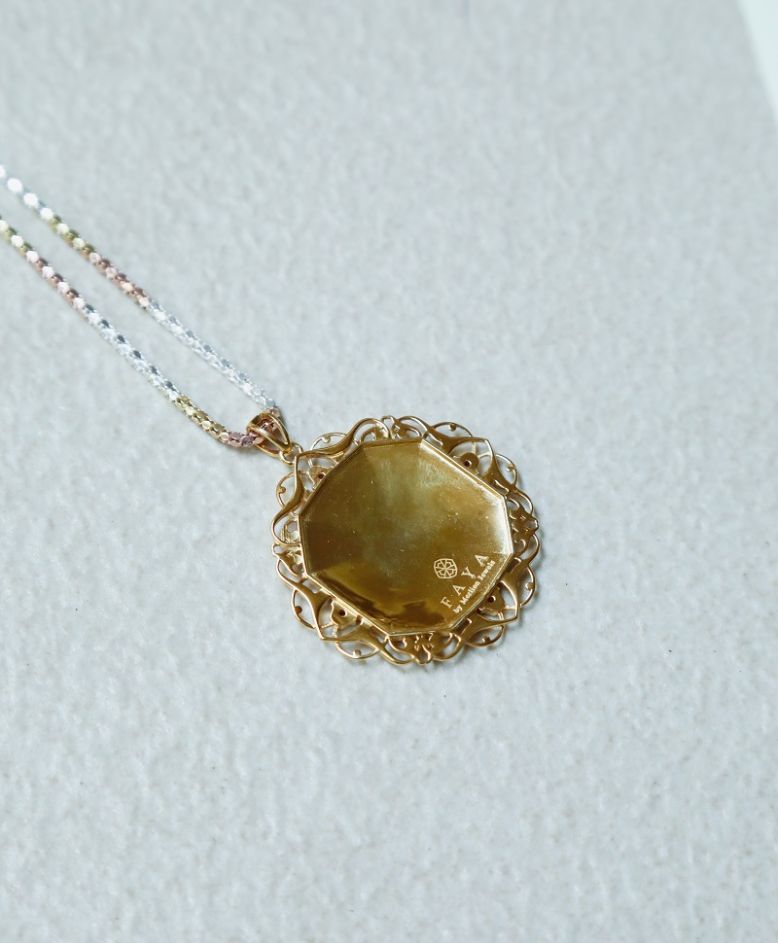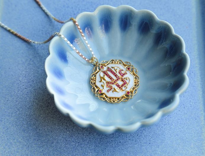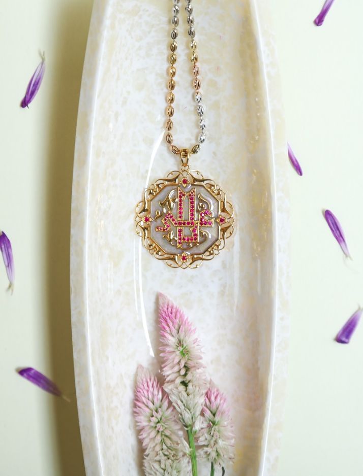 The Roohaniyat Pendant is an extraordinary piece filled with spiritual and divine powers. The attention to detail and intricacy of the design is what makes this an exemplary piece that can be adorned for years. Ya Ali is studded with 53 Burma Rubies & 4 rubies surrounding it totalling 57 pcs of Rubies.
