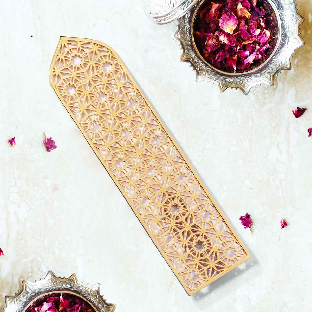 Zayed Bookmark: a blend of artistry and significance. Admire the intricate geometric islamic patterns delicately carved into this exquisite piece, each line and curve a testament to meticulous craftsmanship. Celebrate the spirit of giving with a gift that transcends beauty and holds deep meaning.